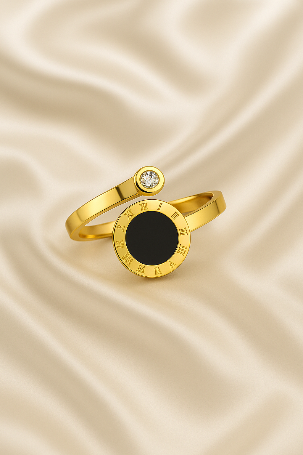 Zachwycający pierścionek Noir Elegance to połączenie nowoczesności i ponadczasowej klasy. Głęboka czerń onyksu otoczona lśniącym złotem tworzy wyrafinowany kontrast, który podkreśla styl i pewność siebie każdej kobiety.