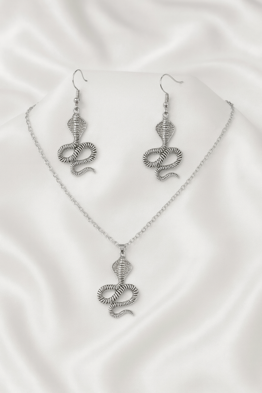 Przyciągaj spojrzenia i podkreśl swój wyjątkowy charakter dzięki zestawowi biżuterii Cobra. Ten efektowny komplet w kolorze srebrnym składa się z naszyjnika i kolczyków w kształcie węża – symbolu mocy, ochrony i tajemniczości.