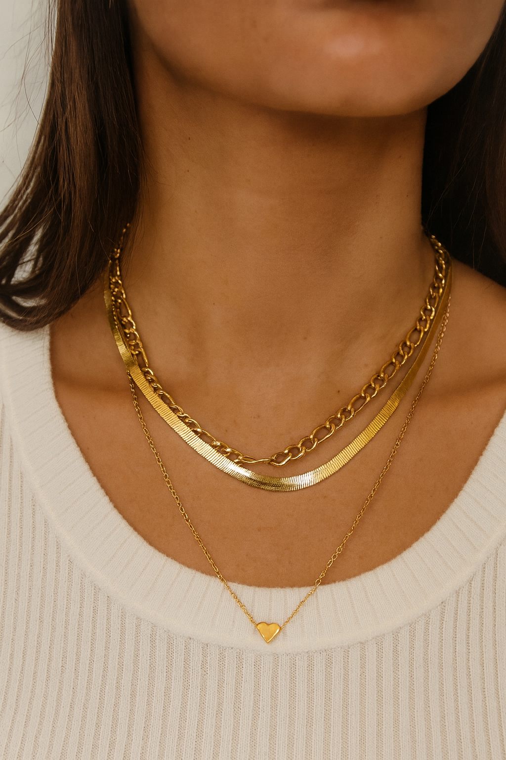 Zestaw „Golden Layers” łączy trzy złote naszyjniki o różnej długości – delikatny łańcuszek z serduszkiem, klasyczny splot oraz połyskujący łańcuszek typu snake chain. Razem tworzą harmonijną kompozycję, która pięknie podkreśla dekolt i pasuje do każdej stylizacji – zarówno codziennej, jak i wieczorowej.