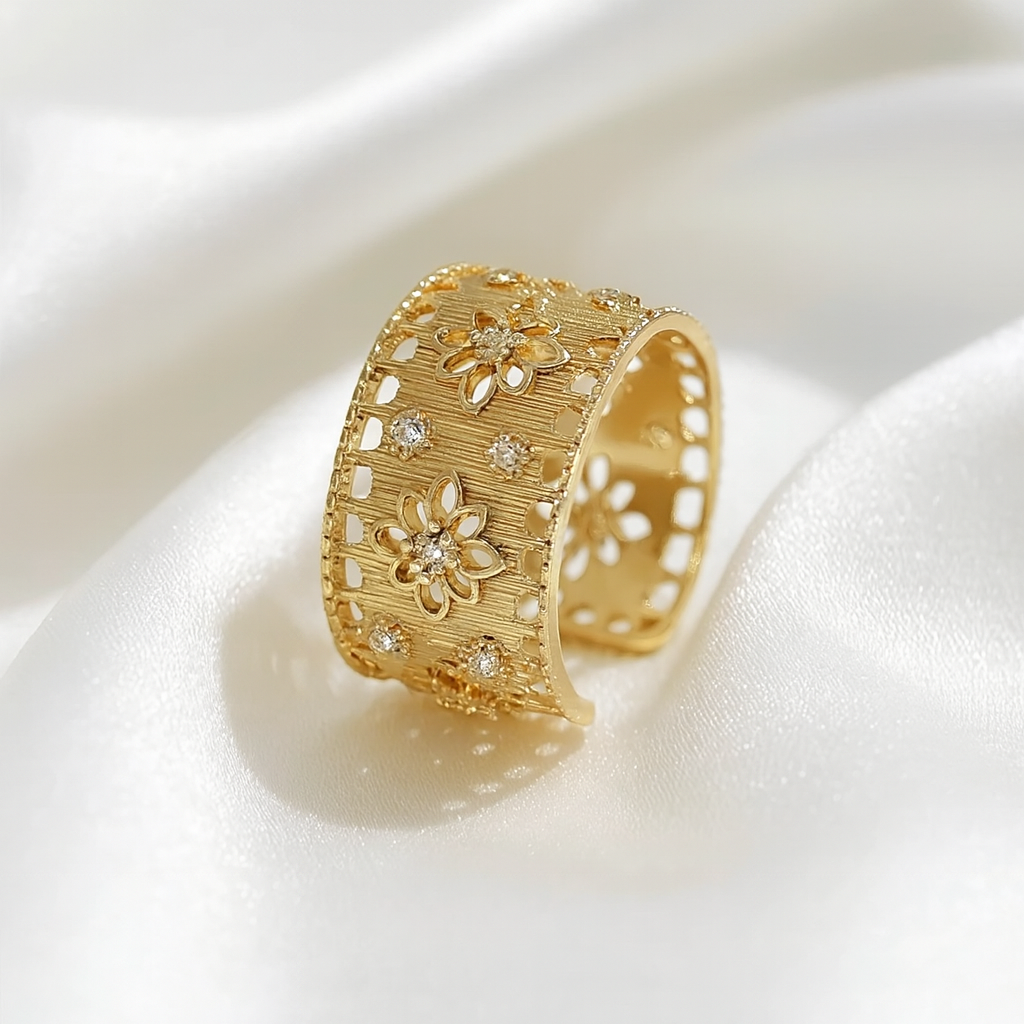 Ten wyjątkowy złoty pierścionek z kwiatowym motywem to połączenie delikatności i luksusu w jednym dodatku. Jego szeroka obrączka zdobiona jest misternymi kwiatami i błyszczącymi cyrkoniami, które pięknie odbijają światło przy każdym ruchu dłoni.